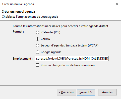 Thunderbird vous demandera vos identifiants PSUD pour accéder à l'agenda.