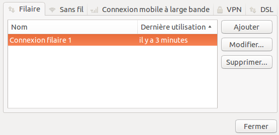 Dans l'onglet “Filaire”, Cliquer sur “Connexion filaire 1” puis sur l'icone “Modifier…”