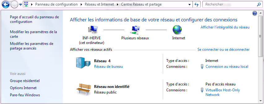 Menu Démarrer puis Panneau de configuration “Réseau et Internet” puis “Centre réseau et partage”