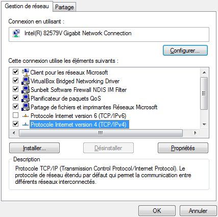 Sélectionner votre carte réseau puis bouton droit “Propriétés” Sélectionner protocole Internet version 4 (TCP/IPv4) puis “Propriétés”
