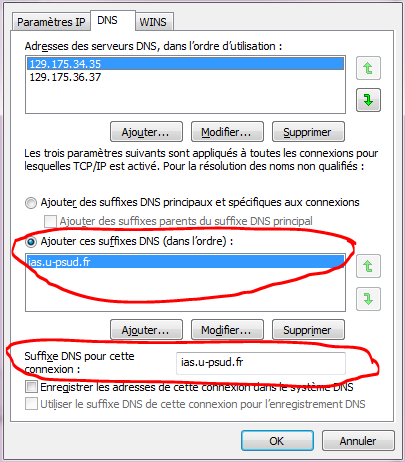 Si le nom de domaine n'est pas encore configuré, cliquer sur “Avancé…” puis sur l'onglet DNS. Rajouter le nom du serveur DNS “ias.u-psud.fr” aux 2 endroits suivants :