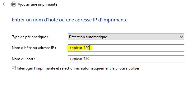 • Si l'imprimante n'apparaît pas dans la liste, cliquer en bas de la liste sur “je ne trouve pas l'imprimante recherchée,..”, puis sur ajouter par adresse TCP/IP ou nom d'hôte puis donner son nom