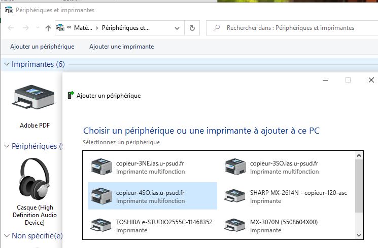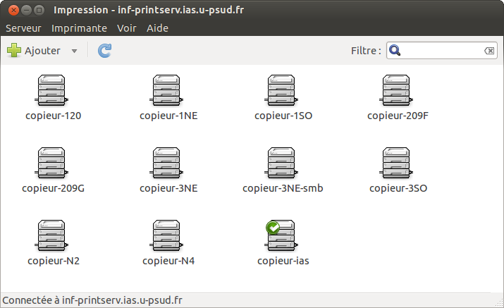 Vous devriez voir la liste des copieurs du laboratoire (par exemple dans l'utilitaire GUI system-config-printer)