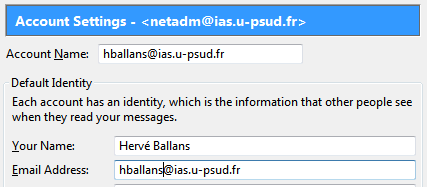 (Sous Thunderbird, la configuration se fait dans le menu Outils / Paramètres des comptes / nom du compte ) Le nom vous permet de spécifier un nom sous une forme usuelle qui apparaîtra à vos interlocuteurs.