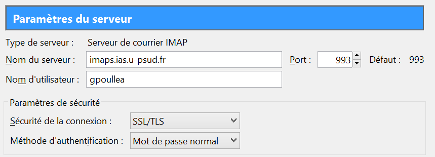 nom du serveur = imaps.ias.u-psud.fr port : 993 Type de sécurité de la connexion : SSL/TLS