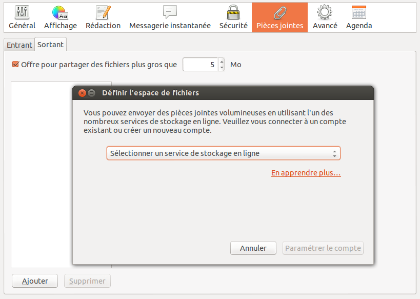Puis dans l'onglet “Sortant”, sélectionnez la case “Proposer le partage pour les fichiers de plus de 5 Mo” (la taille peut se configurer, même si 5 Mo parait être un bon compromis)