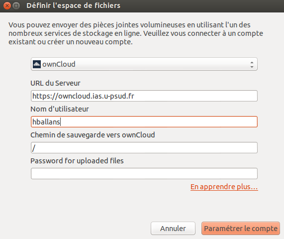 Inscrivez l'URL du serveur OwnCloud : https://owncloud.ias.u-psud.fr et votre identifiant de messagerie.
