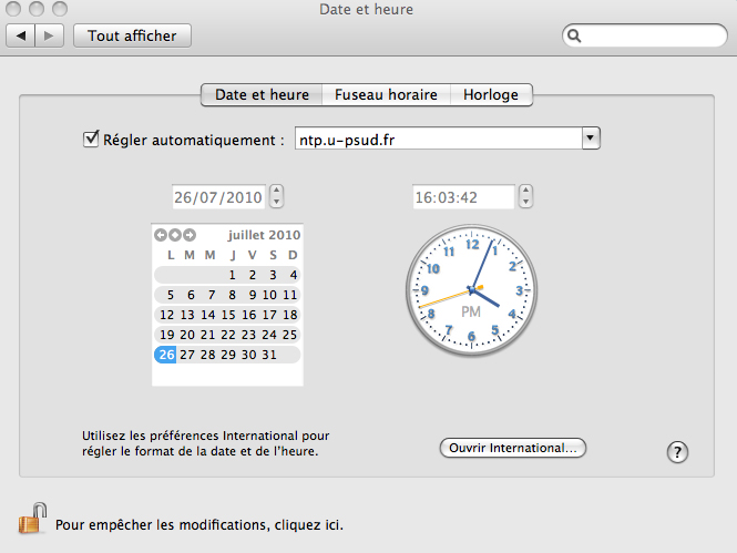 Sur le campus de l’Université Paris XI le serveur a utiliser est : ntp.u-psud.fr (ou ntp.ias.u-psud.fr adresse qui relaie ce serveur)