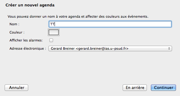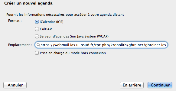 Sélectionner “CalDAV“ et coller https://zimbra.u-psud.fr/dav///prenom.nom//@u-psud.fr/calendar dans “Emplacement”